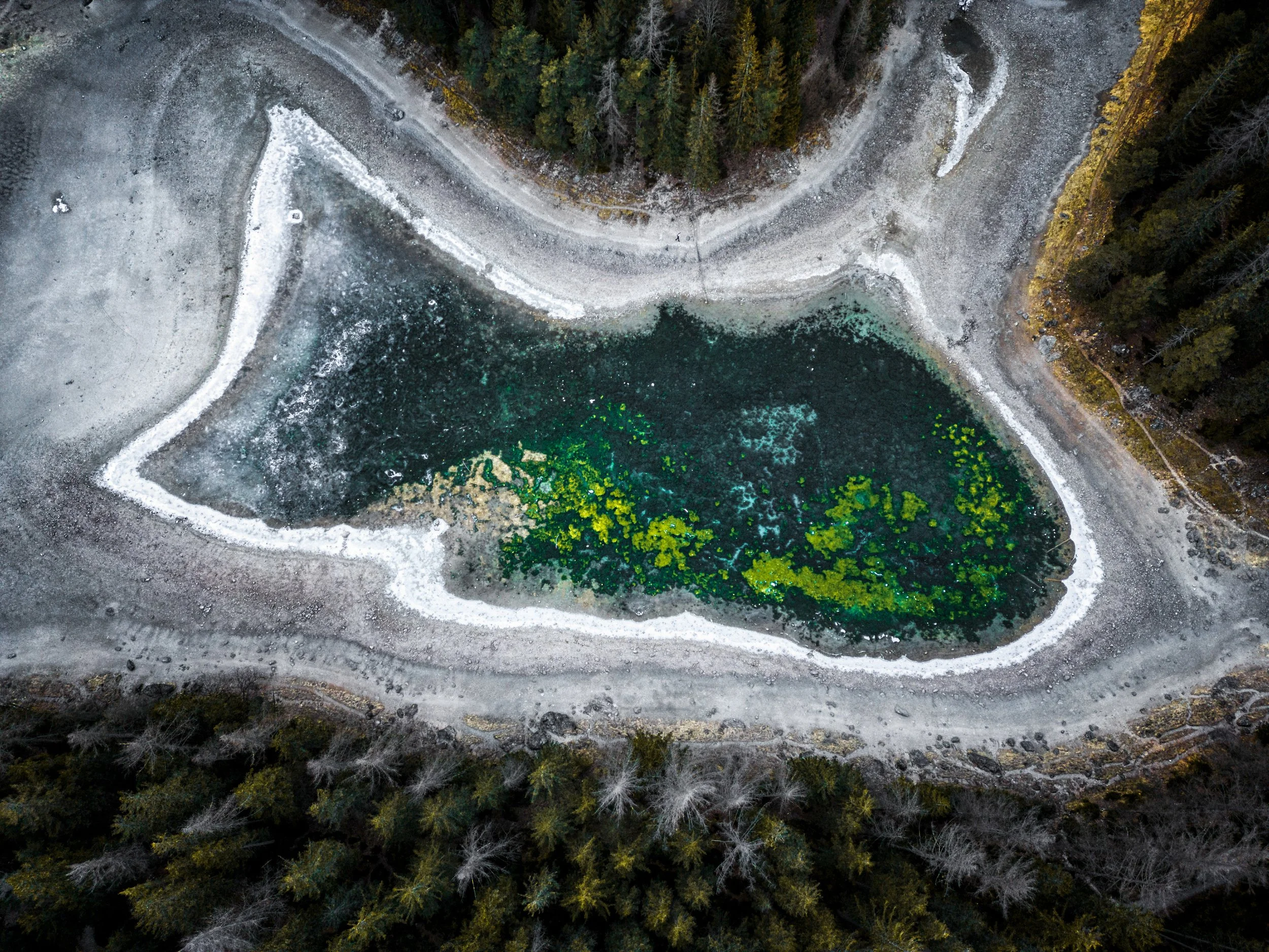 Im Winter ist der Grüne See in Tragöß nur noch ein Schatten seiner selbst, jedes Jahr im Frühling aber schwillt er dank der Schneeschmelze dann wieder zu seiner vollen Pracht an; jetzt, in der kalten Jahreszeit, bleibt ihm als Laune der Natur zumindest ein verspieltes Fisch-Mimikri über, denn außer Warten hat der Grüne See im Moment ja nicht recht viel “zu tun”….